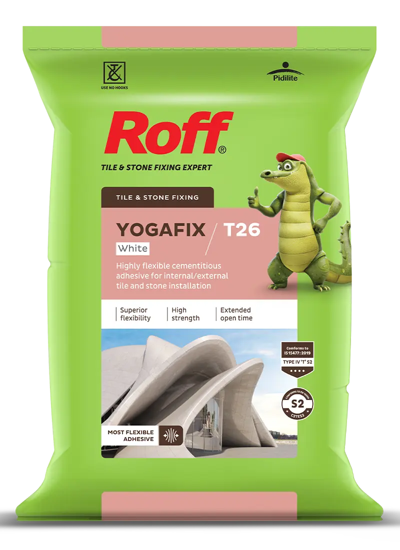 Roff Yogafix Grey & White is a high polymer modified & highly flexible adhesive with enhanced properties of slip resistant, extended open time & excellent bond strength which is necessary for fixing large format tiles/ natural stones & slim tiles on vertical & horizontal surface for indoor as well as outdoor application especially in external conditions, high footfall areas & on substrates subject to high deformations/ vibrations.