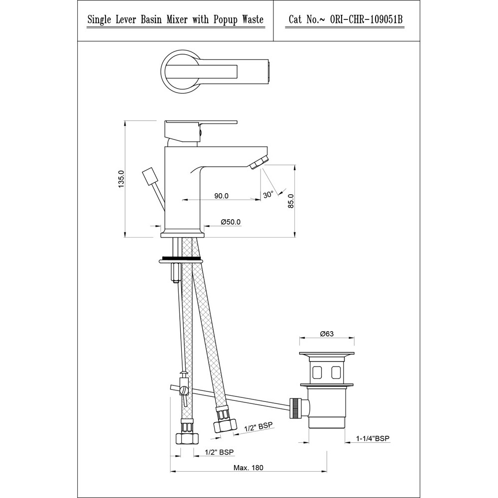 Single Lever Basin Mixer with Popup Waste with 450mm Long Braided Hoses