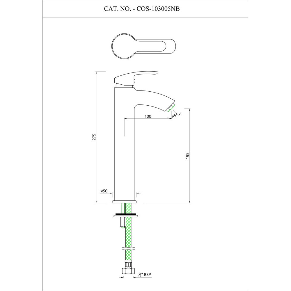 Single Lever High Neck Basin Mixer without Popup Waste, with 600mm Long Braided Hoses