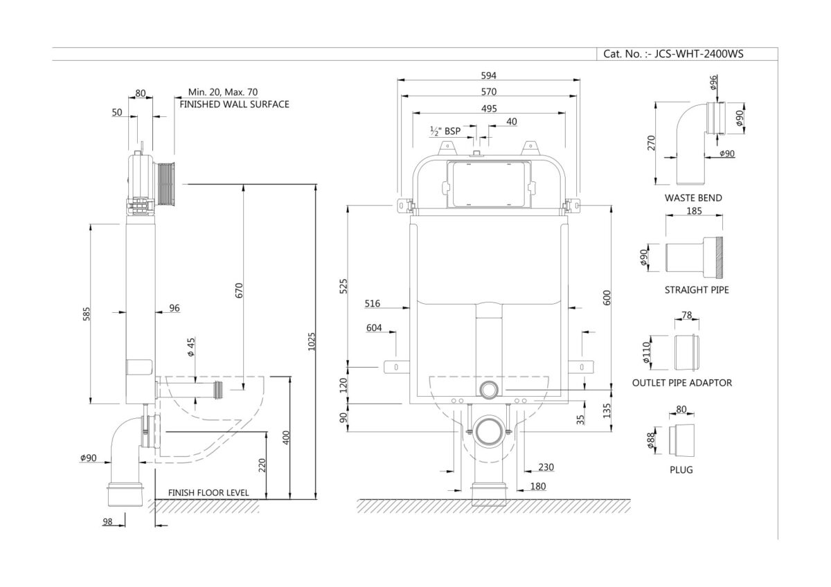 Single Piece Slim Concealed Cistern With Wall Mounting Frame, Installation Kit And “S-Type” Drain Pipe Connection Set For Wall Hung Wc (Without Flush Control Plate)